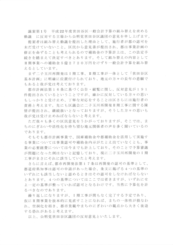 引き続き、平成22年度世田谷区一般会計予算他5特別会計予算は賛成多数で